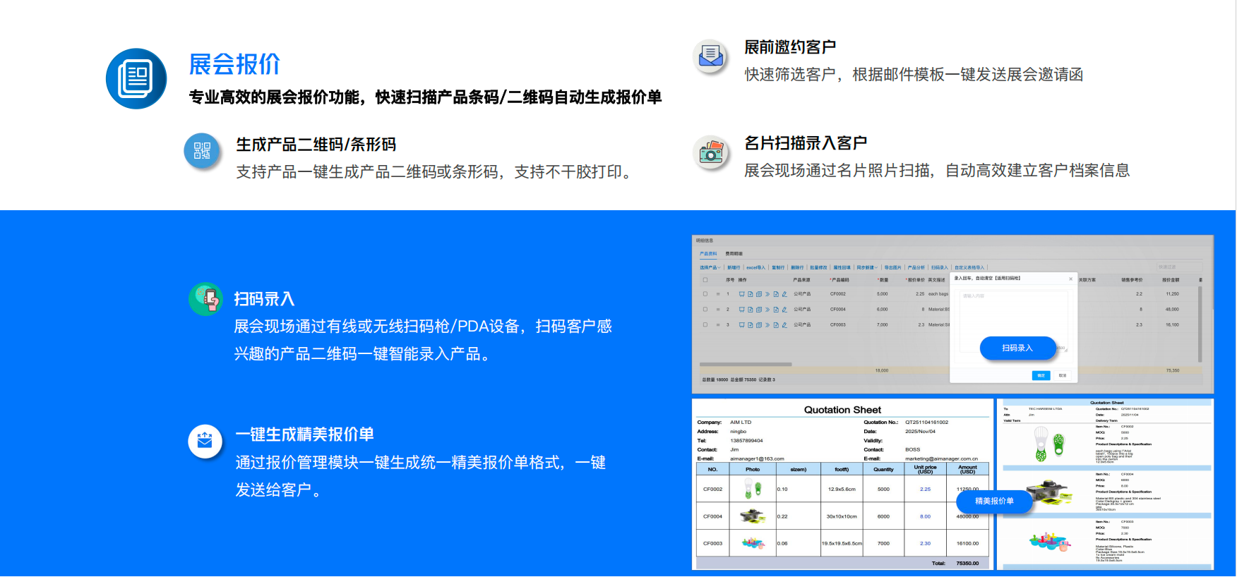 迈纳杰展会报价系统上线,助力外贸企业展会高效专业的报价,接待展会报价从名片扫描输入-合照-扫码报价-一键邮件发送给客户,让繁琐的过程简单高效的通过迈纳杰展会报价系统轻松实现,让您的没接待的客户,走出你的摊位的时候,手机上就收到客户关注产品的精美报价单,让客户的体验到高效完美的服务!
